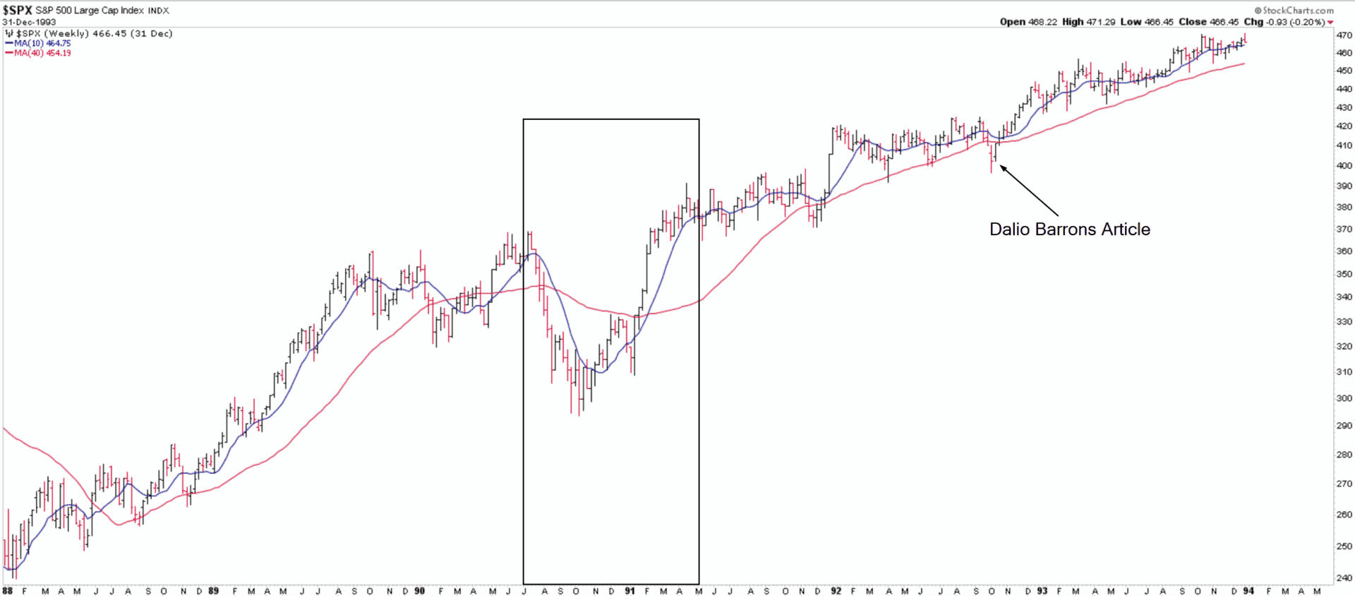 If you look at the chart below you will see a few things. One is that the “recession” period marked by the big rectangle was not that bad. Being down -20% is not great but when you are at new highs a few months later it is not that devastating. But then look a bit farther along. Dalio’s worry about the economy was in the midst of a bull run in equities that must have seemed ludicrous and yet it didn’t stop.