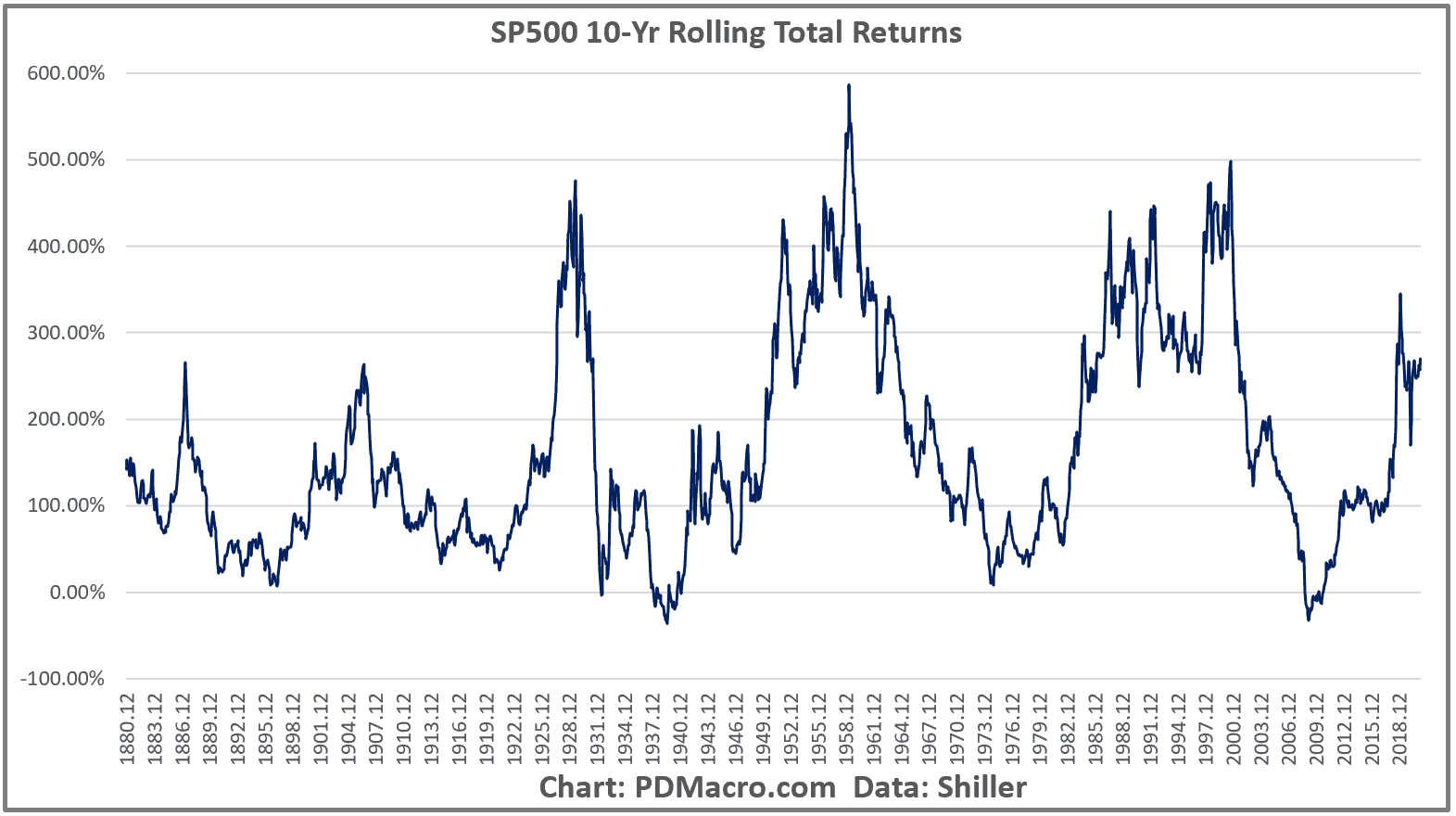 If you follow @Jesse_Livermore on Twitter, and you should, then you know that while he is an anonymous account he is also a great researcher and is very giving of his research. One of his pieces “The Single Greatest Predictor of Future Stock Market Returns” introduced the world to the “Average Investor Equity Allocation” model. This model does a fantastic job of forecasting forward 10-Yr returns based on Fed data on the investors allocation to equities. When everyone is into stocks, and that is a relative version of everyone, then stocks stink, and when no one owns them, they rock. Right now the model is saying that over the next 10 years the SP500 probably sees around 2%/yr. Not exactly awesome by YOLO standards, or even prudent investors standards.